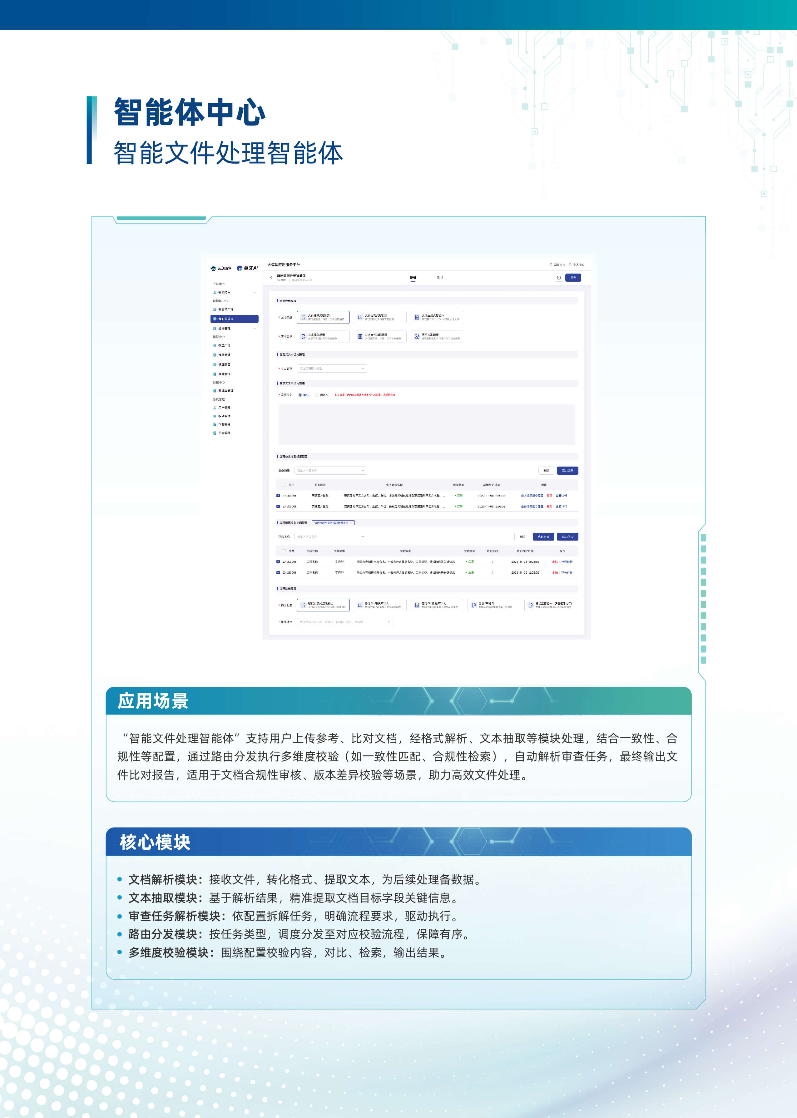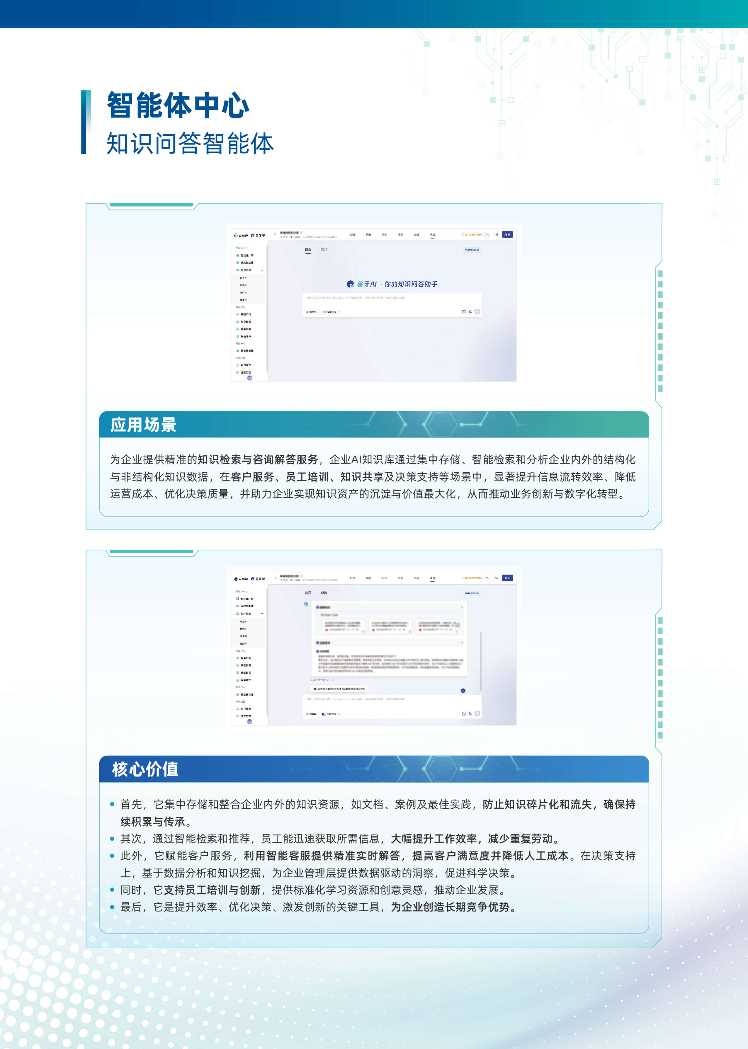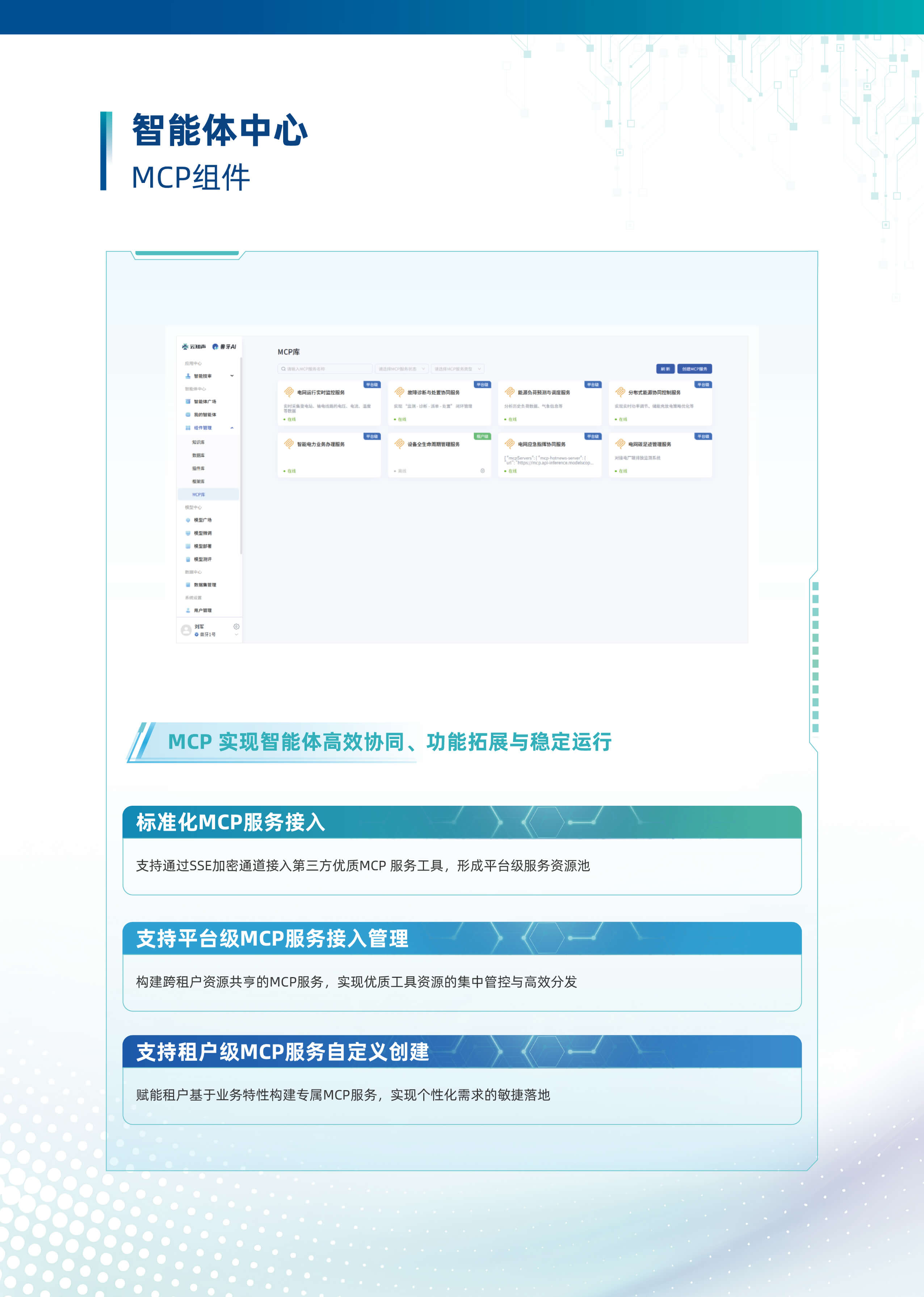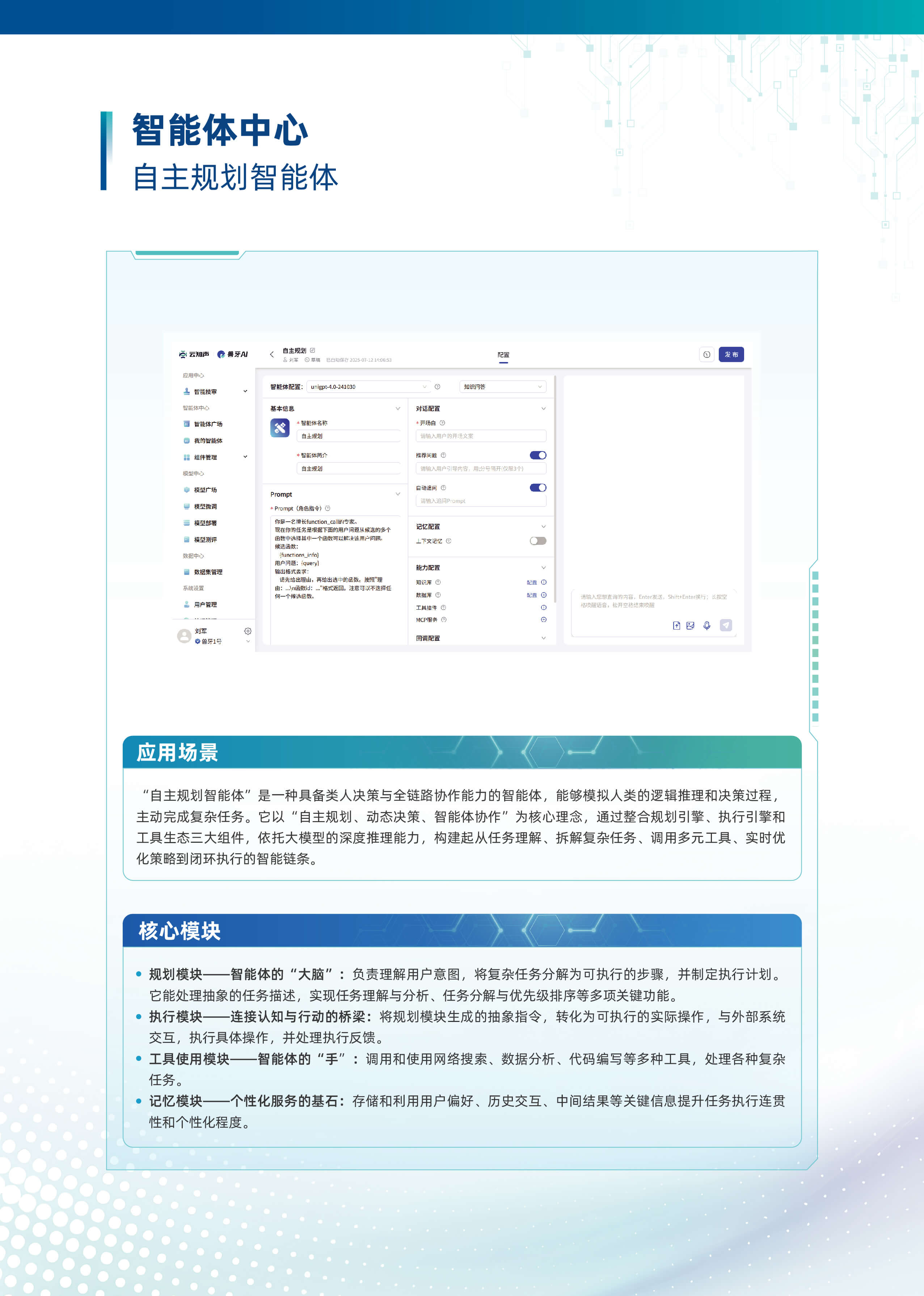 以“行業大模型+場景化智能體”為核心,深度融合多源數據與業務邏輯,構建企業全鏈路AI數智化基座。平台基於自主可控的行業大模型技術,首創輕量化智能體編排框架,支持外掛知識庫、MCP服務、多模態API及數據庫的動態調用與協同,實現跨係統數據融合與業務敏捷響應。平台依托行業大模型,創新推出三類智能體。自主規劃型智能體可自主靈活調用多渠道多維度數據,實現高效決策。知識問答型智能體憑借精準的問題理解與解析能力,快速響應各類疑問。智能問數型智能體通過自然語言交互,挖掘海量數據價值。