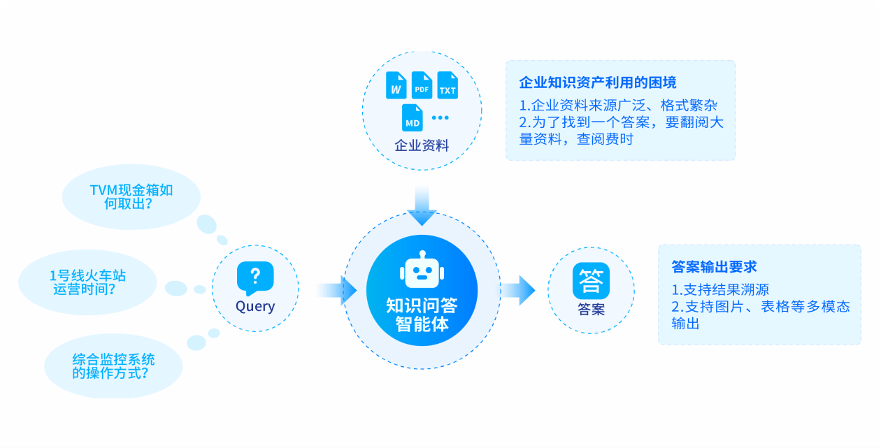 依托大模型構建全麵的企業知識庫,專注於企業規章製度、政策文件、工作流程及項目管理等內外部資料的精準智能問策服務。係統支持多輪對話交互,實現信息溯源與深度學習,功能覆蓋知識問答、垂直搜索及文本自動化生成,為用戶提供專業、高效且個性化的知識處理與決策輔助。